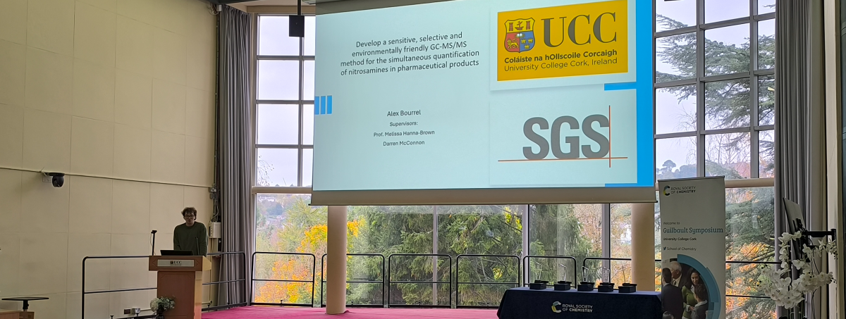 This collaboration recently saw UCC Master’s student Alex Bourrel complete a research project on the development of an analytical method for detecting multiple nitrosamines using GC-MS/MS, an essential technique in pharmaceutical quality control and safety assessment.